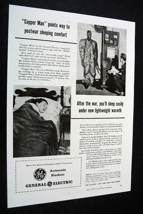 General Electric จึงเริ่มโฆษณาผ้าห่มไฟฟ้าโดยเน้นความเกี่ยวข้องกับการผลิตชุดสูท "ทำความอุ่นด้วยไฟฟ้า" สำหรับนักบินที่สู้รบในสงคราม ภาพลักษณ์ของผ้าห่มเปลี่ยนไปจากของที่คนป่วยหรือผู้สูงอายุต้องการ